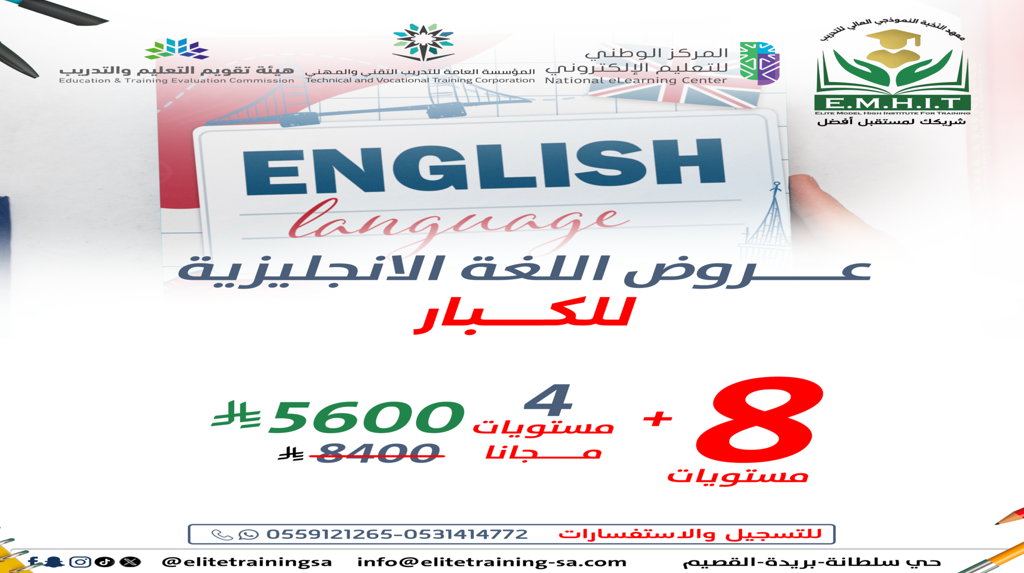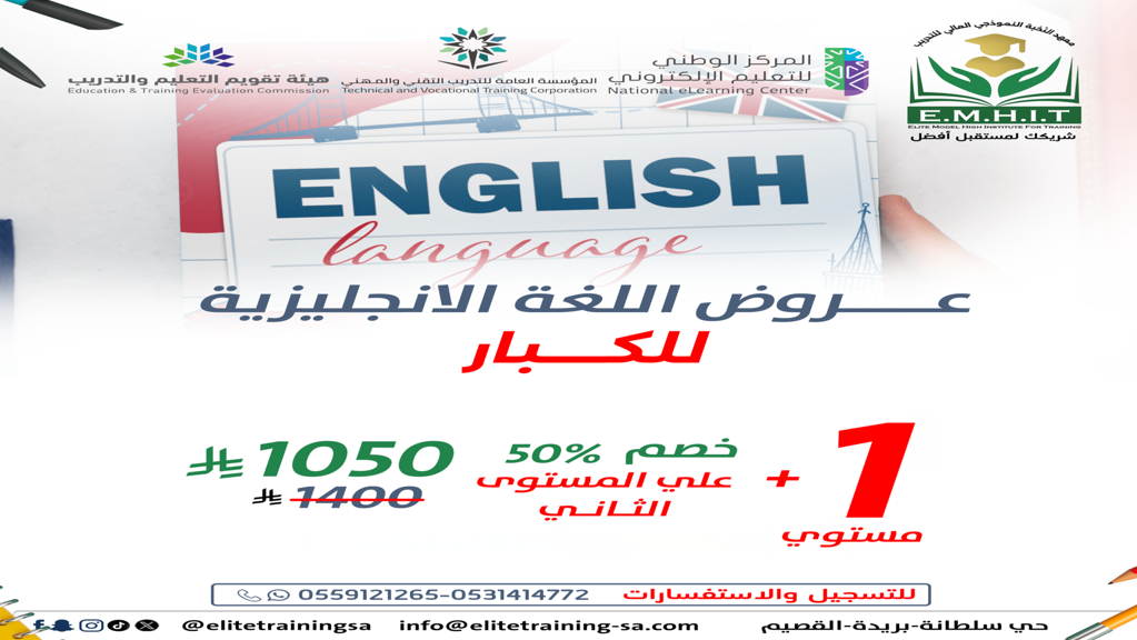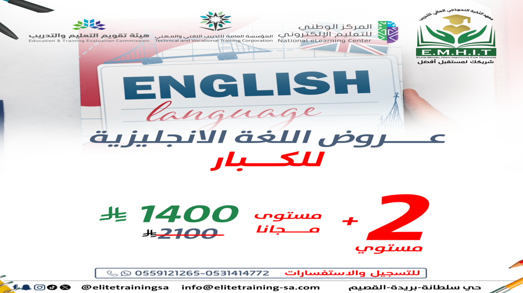- اتباع مسار كامل من التأسيس إلى التواصل المتقدم باللغة الإنجليزية