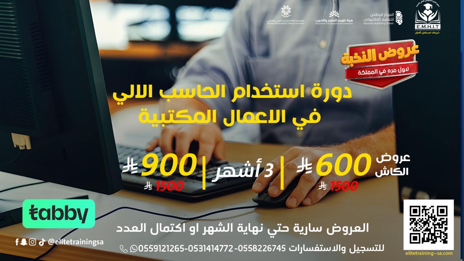 - يهدف هذا الدورة التأهيلية إلى تزويد المتدربين بالمهارات والمعلومات الأساسية اللازمة لاستخدام الحواسيب في العمل المكتبي، استنادًا إلى أحدث إصدارات حزم برامج مايكروسوفت أوفيس. كما يؤهل البرنامج المتدربين لاجتياز اختبار شامل تجريه المؤسسة العامة للتدريب التقني والمهني.